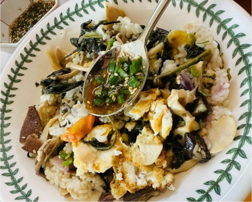 - 완성된 산채밥을 넓거나 깊은 볼에 담고, 간장장과 계란후라이를 얹어 비벼 먹습니다.