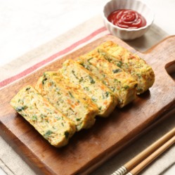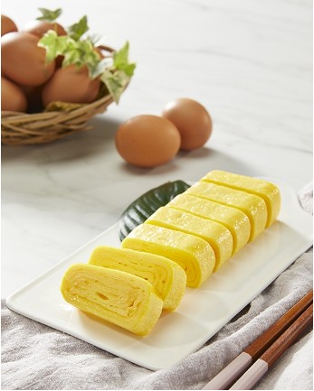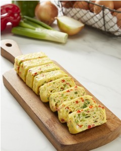 - 완성 계란말이가 적당한 두께와 색이 나올 때까지 반복하여 조리합니다. 완성된 계란말이는 도마에 올려 식힌 후, 먹기 좋은 크기로 썰어줍니다.