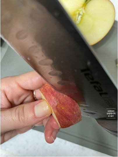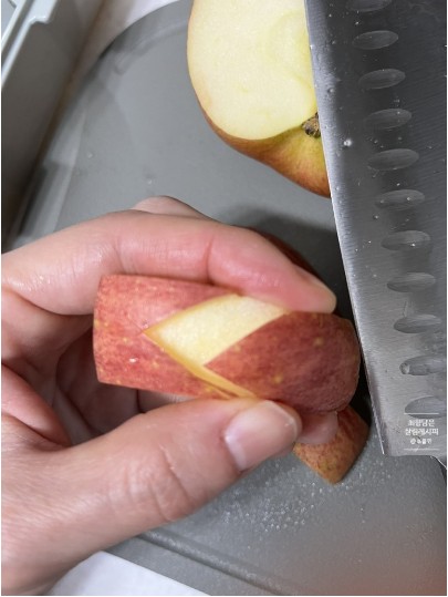 - 칼집 내기: 사과 껍질에 V자 모양으로 칼집을 냅니다.