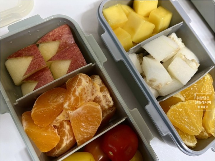 - 도시락 꾸미기: 깔끔하게 손질된 과일들을 도시락 통에 예쁘게 담아줍니다.