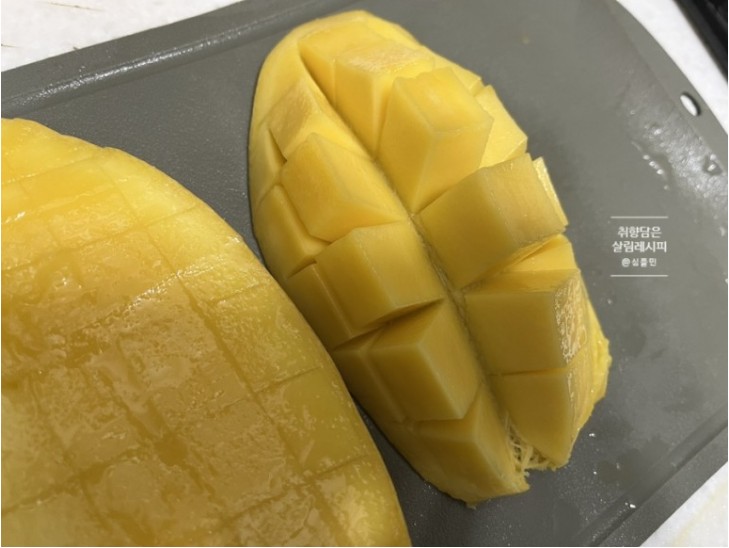 - 격자무늬 칼집 내기: 망고에 껍질이 닿을 때까지 격자로 칼집을 냅니다.