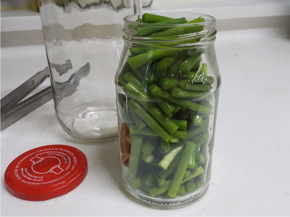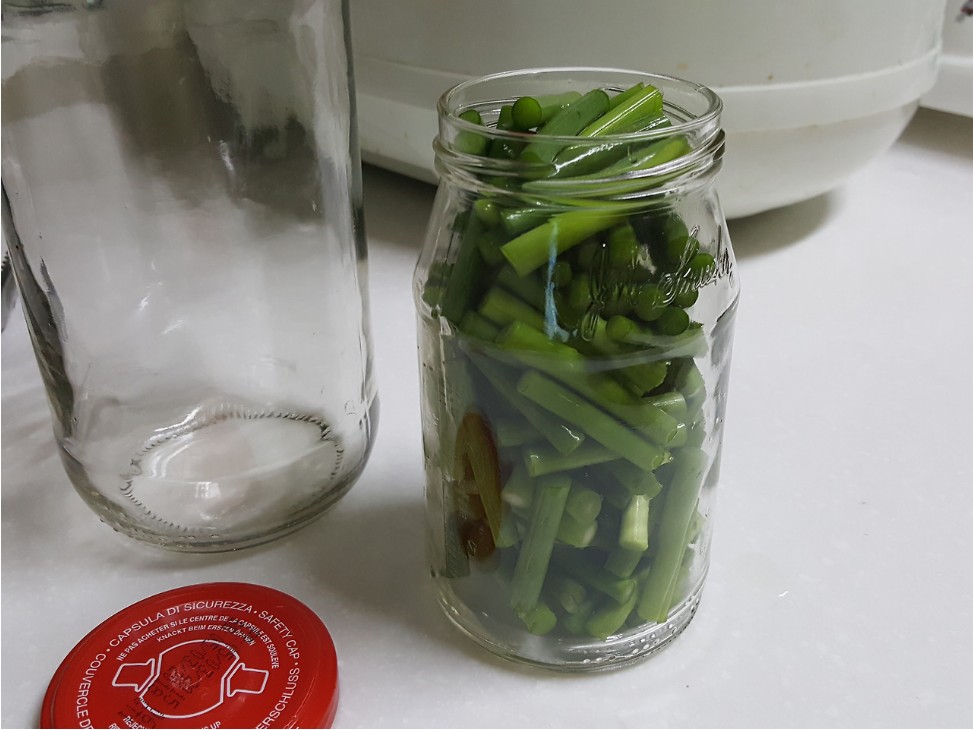 - 소독한 유리병에 자른 마늘쫑을 넣습니다.