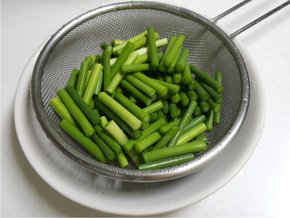 - 마늘쫑 손질: 마늘쫑을 흐르는 물에 깨끗이 씻고, 먹기 좋게 4cm 길이로 자릅니다. 지저분한 부분과 마디가 있는 부분은 제거합니다.