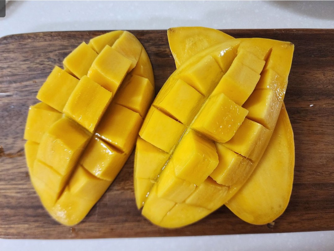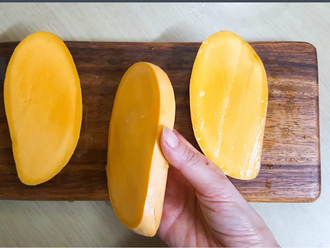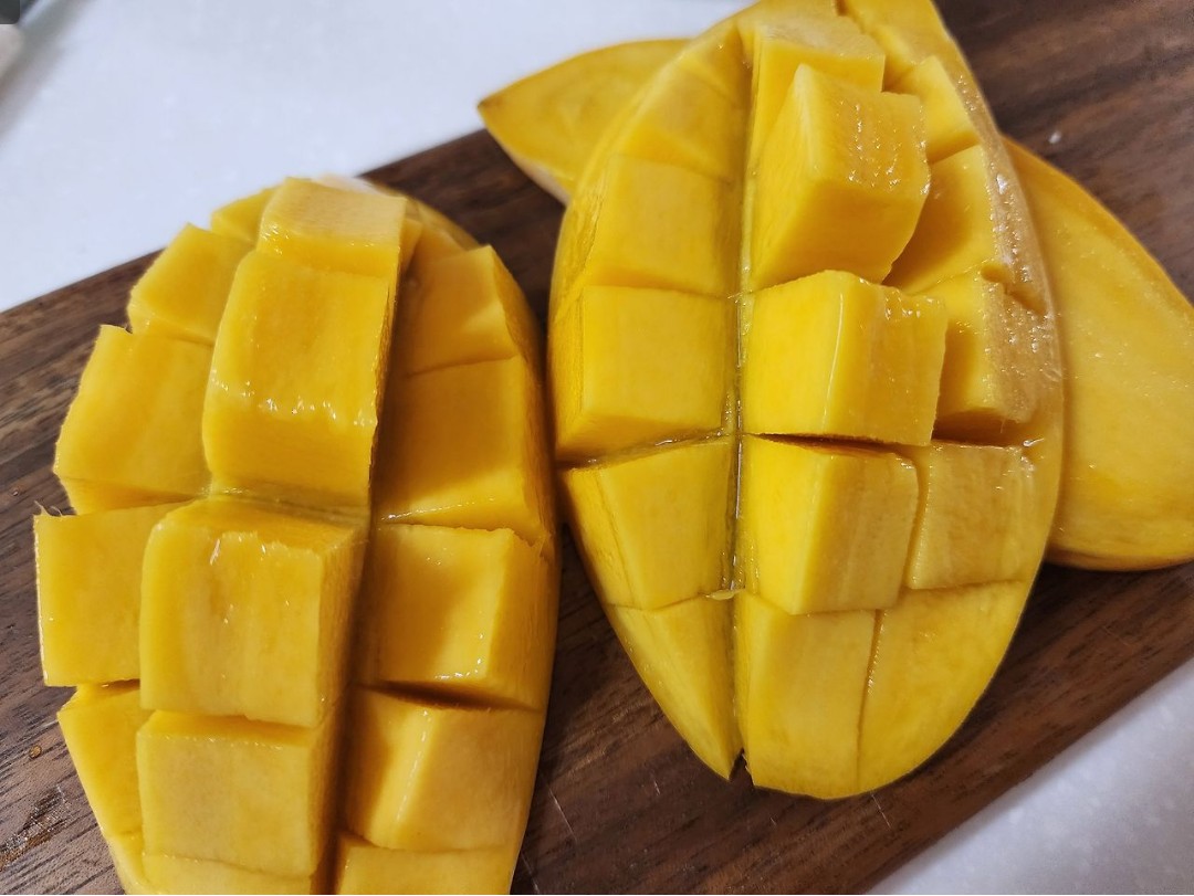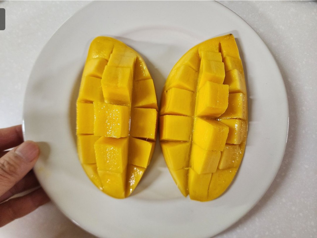 - 망고를 자를 때는 씨를 피해 바둑판 모양으로 자르거나 슬라이스하여 예쁘게 손질합니다.