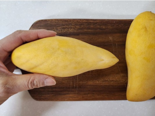 - 망고를 세운 상태로 좁은 쪽을 위로 하고, 가운데 씨를 피해 좌우로 자릅니다.
