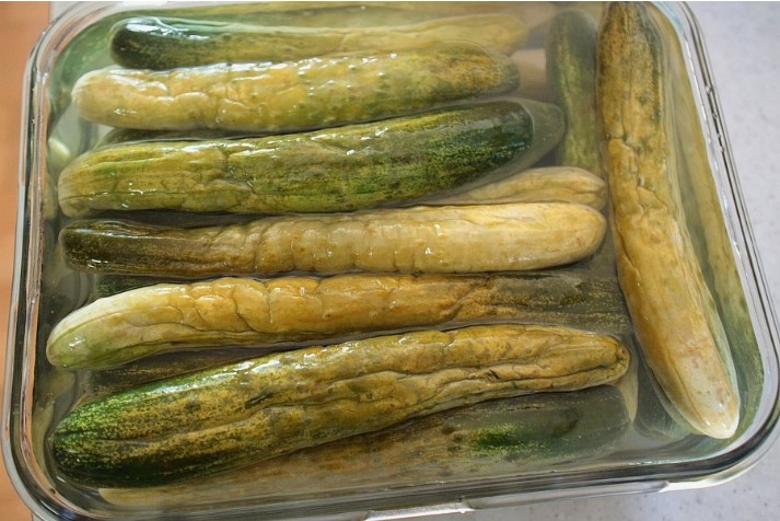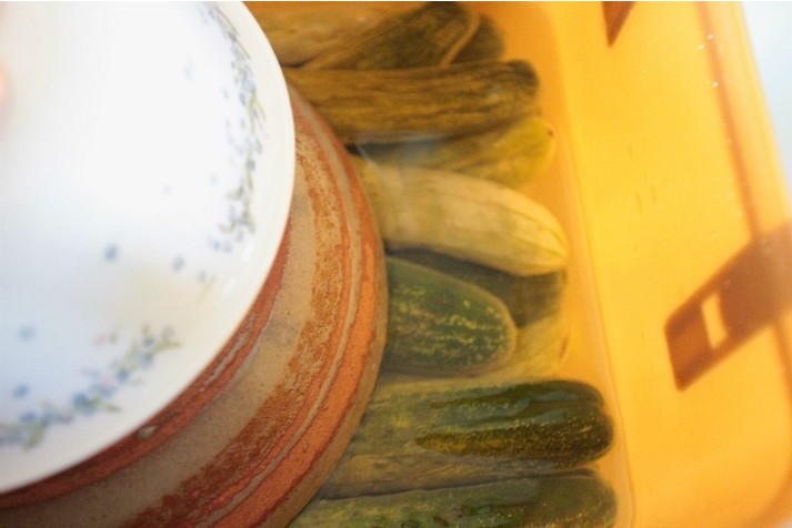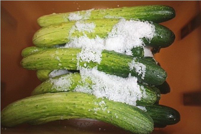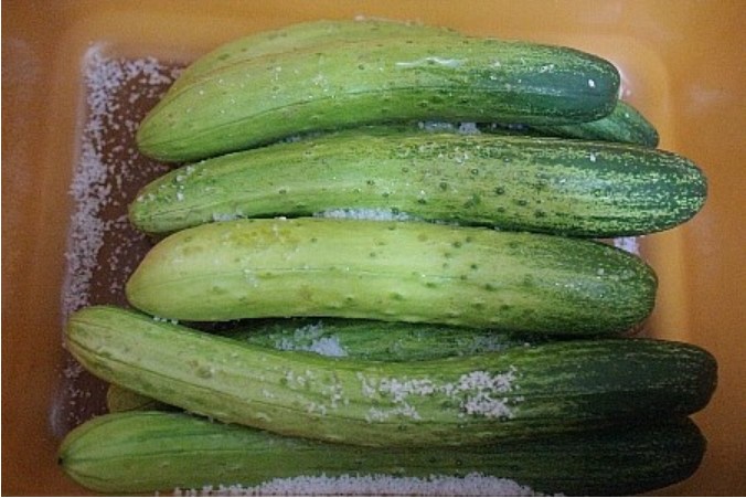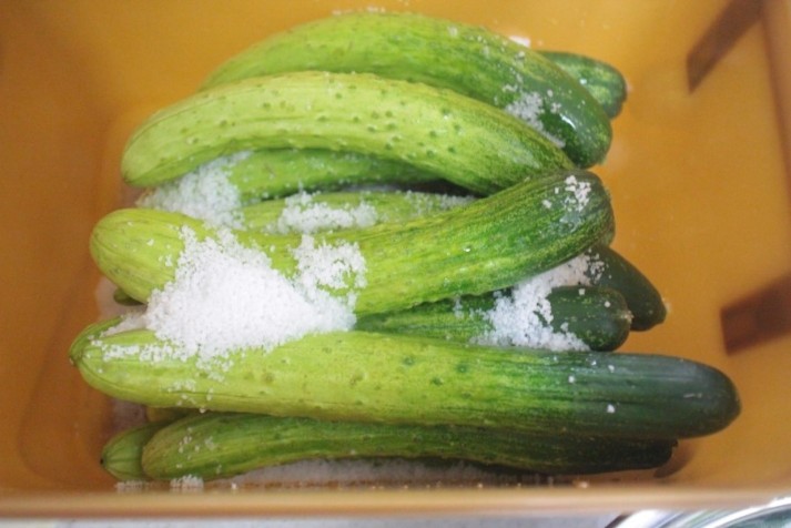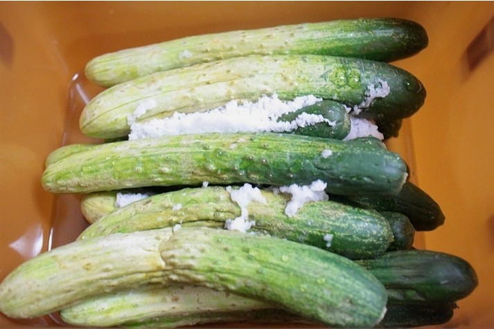 - 오이를 절이는 동안 위아래를 하루에 한 번씩 뒤집어 절임물이 골고루 스며들도록 합니다.