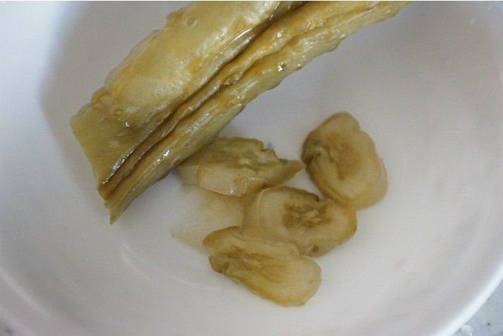 - 짠기를 뺀 오이지를 나박나박하게 자릅니다.