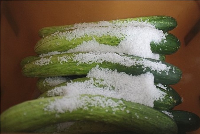 - 소금과 식초를 준비한 비율대로 부어줍니다. 오이를 넣으면서 켜켜이 소금과 식초를 넣어도 좋고, 모두 넣은 후에 소금과 식초를 한꺼번에 부어도 좋습니다.