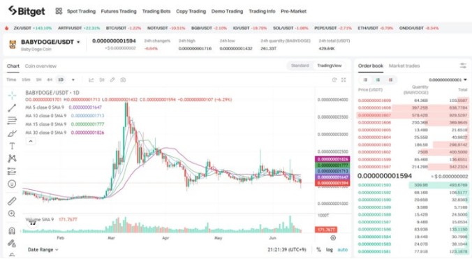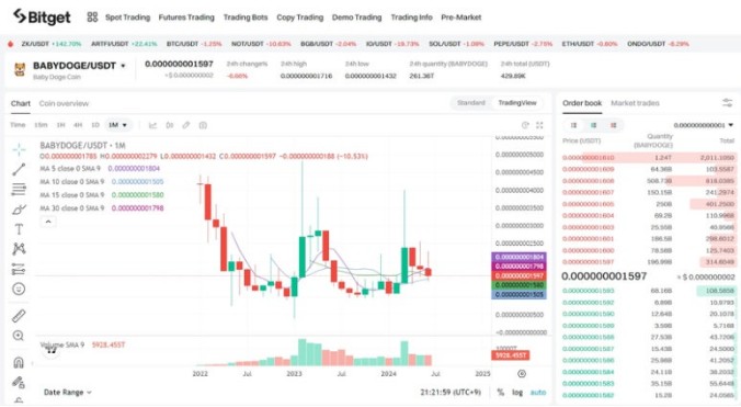 월봉 차트 분석: 베이비도지코인은 2022년 비트겟에 상장된 이후, 몇 차례 큰 상승과 하락을 반복했습니다. 패턴이 반복되는 경향이 있어, 다음 상승장에서 큰 상승을 기대할 수 있습니다.