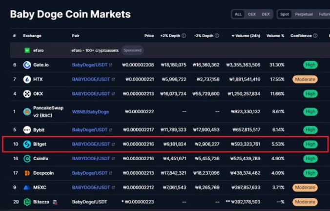 베이비도지코인은 다양한 거래소에서 거래 가능합니다. 대표적인 거래소로는 게이트아이오(Gate.io), HTX, OKX, 바이비트(Bybit) 등이 있습니다. 비트겟 거래소는 특히 높은 선물거래량과 국내 대형 거래소와의 트래블룰 연동이 되어 있어 추천드립니다.