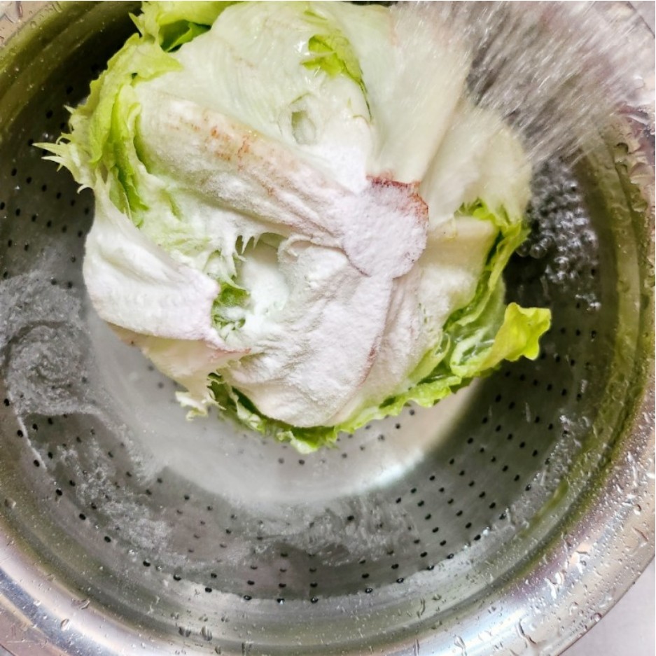 - 베이킹소다 세척: 큰 그릇에 물을 채우고 베이킹소다를 한 스푼 넣습니다. 양상추를 담가서 1~2분 정도 가볍게 흔들어 씻어줍니다.