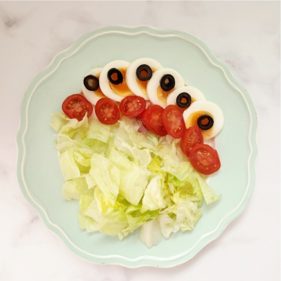 - 샐러드 조합: 큰 볼에 양상추를 담고 방울토마토, 슬라이스한 계란을 올립니다. 올리브는 데코로 사용합니다.