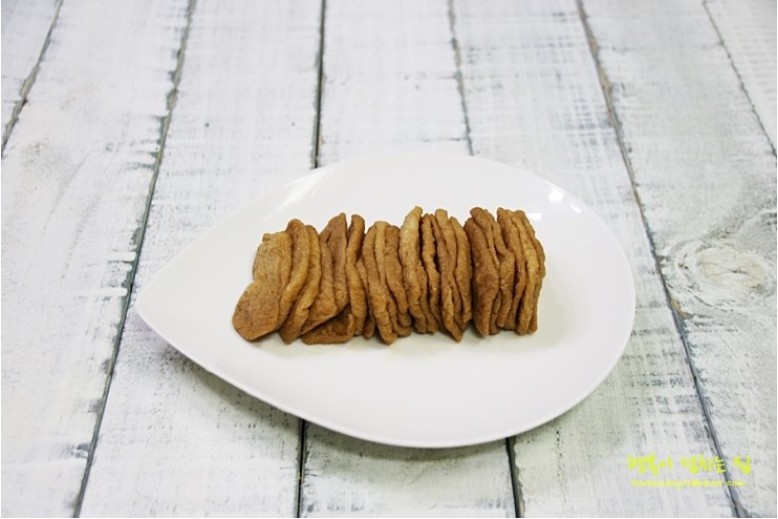 - 유부를 반으로 잘라 네모난 모양을 만듭니다.