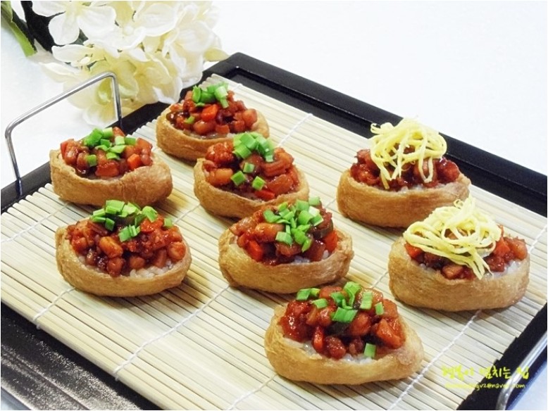 - 매콤 오징어볶음 유부초밥: 네모난 유부 위에 매콤한 오징어볶음을 올려 맛과 모양을 동시에 즐길 수 있습니다.