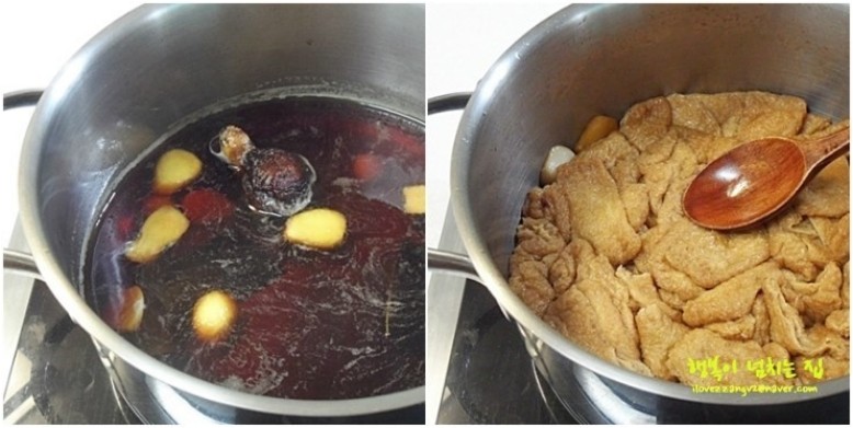 - 냄비에 물 1컵, 설탕 4큰술, 간장 3큰술, 미림 2큰술, 다시마, 건표고, 마늘, 생강을 넣고 끓입니다.