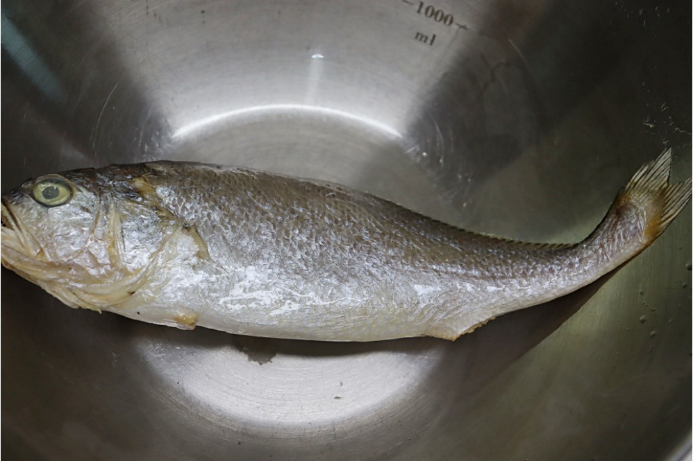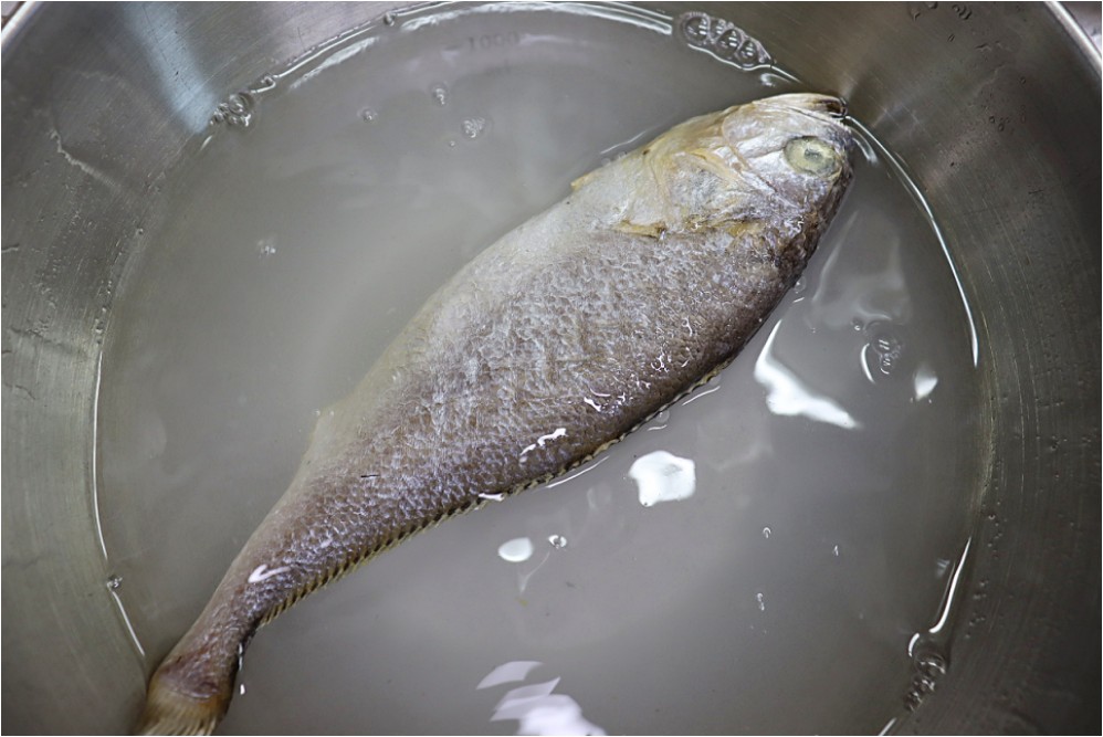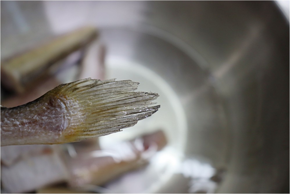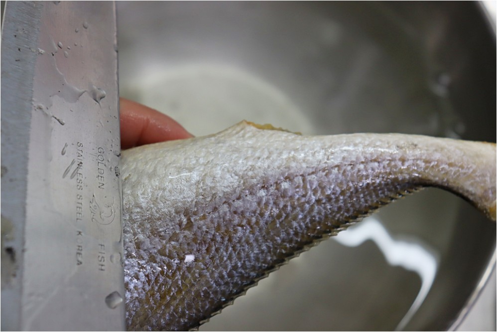 조기를 밀가루 1큰술을 물에 풀어 담가 생선의 비린내를 제거합니다. 미리 손질해둔 조기여서 지느러미와 아가미는 제거된 상태입니다. 비늘 제거도 중요합니다. 제거하지 않으면 생선 비린내가 날 수 있습니다. 지느러미와 꼬리는 제거하셔도 되지만, 제사상에 올릴 경우 꼬리에 모양을 내도 좋습니다. 깨끗하게 손질한 조기는 키친타월로 물기를 제거합니다.