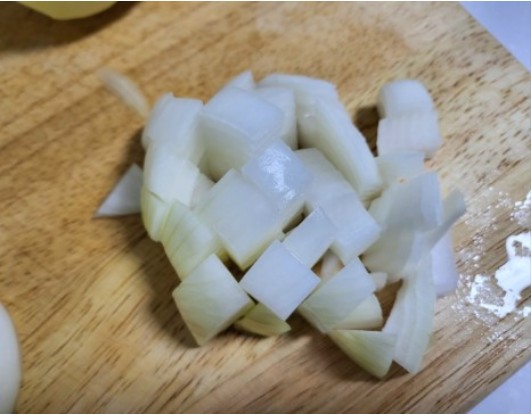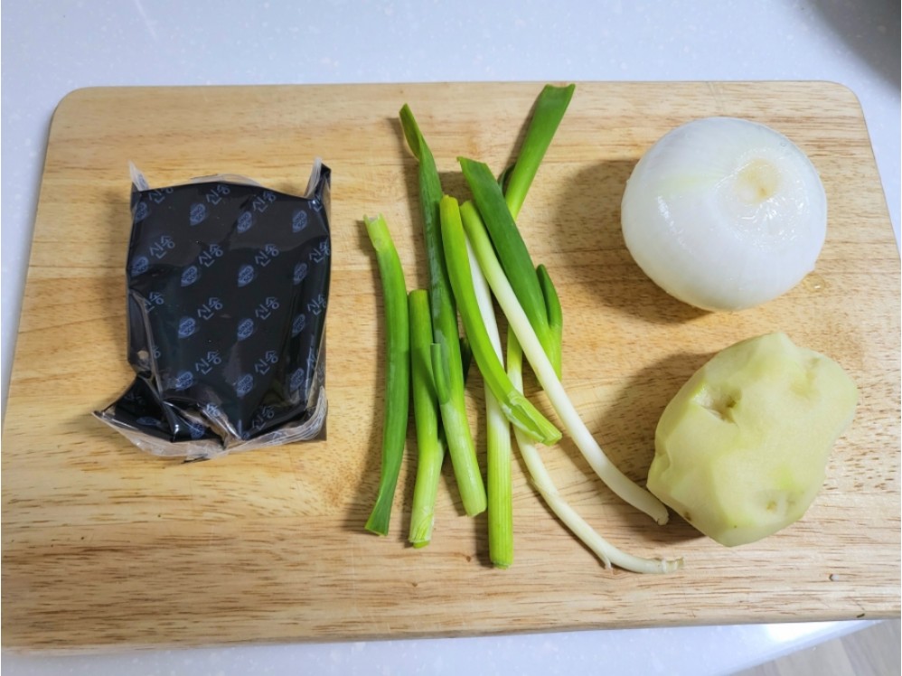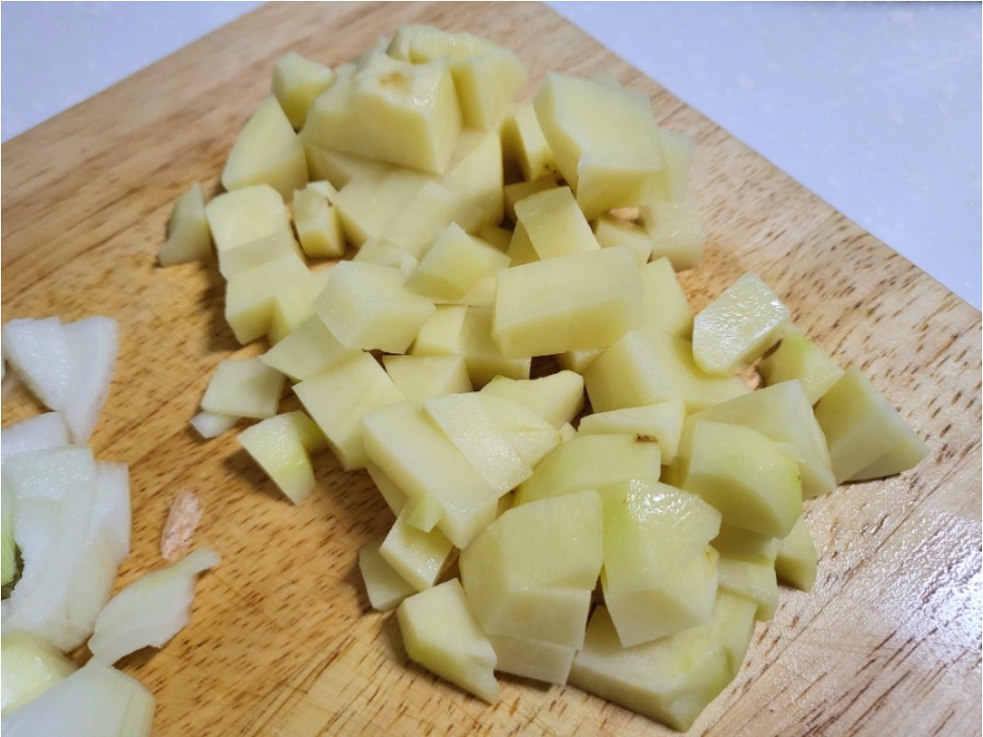 대파를 송송 썰고, 양파와 감자는 먹기 좋게 깍둑썰기합니다. 돼지고기를 사용하고자 하는 경우, 카레용 돼지고기를 준비합니다.