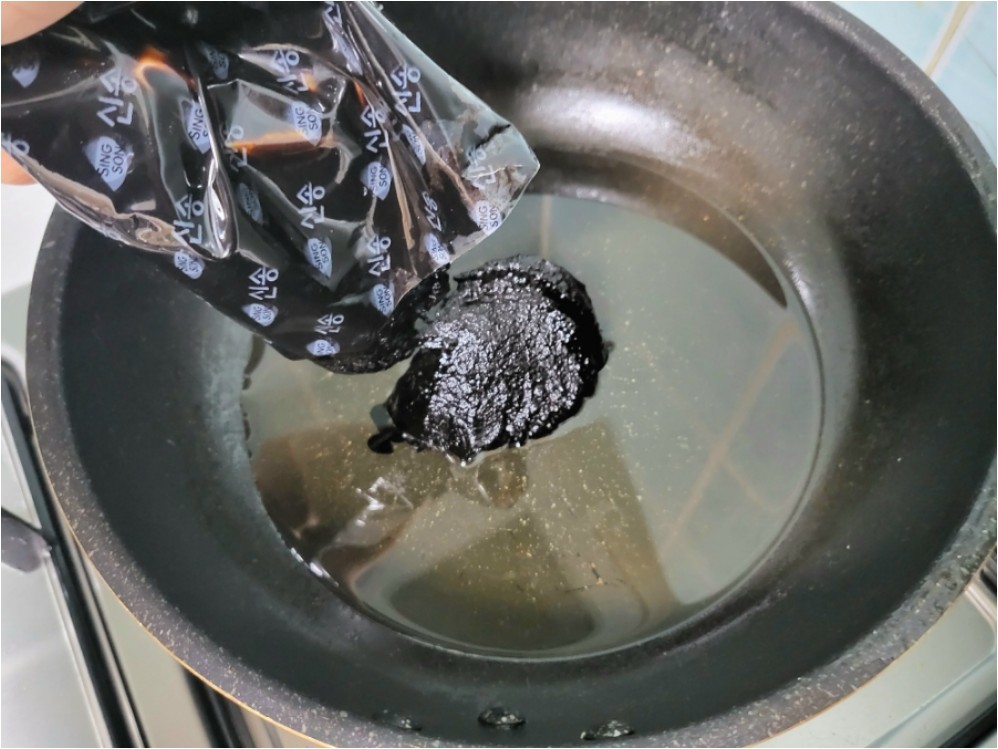 재료 손질이 끝나면 춘장을 기름에 볶습니다. 식용유 2컵에 춘장 3~4인분 분량을 넣고 불을 올려줍니다. 춘장을 볶을 때 기름이 춘장 사이사이로 잘 스며들도록 볶습니다. 충분히 볶은 후 식용유와 춘장을 분리하여 대기시킵니다.