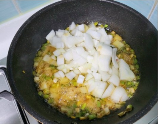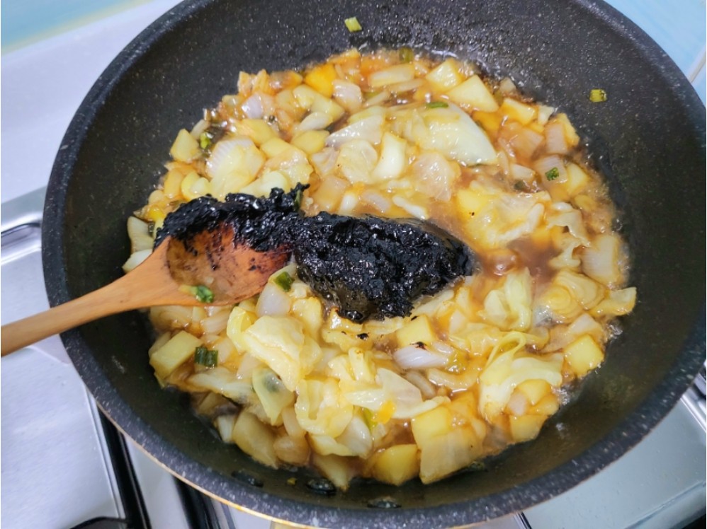 고기가 있다면 이때 넣고, 저는 감자를 넣고 볶다가 약간 익었을 때 양파를 넣었습니다. 적당히 볶다가 간장 1/5컵을 넣어 향을 내고, 양배추 한 줌을 넣어 함께 볶습니다. 양배추가 숨이 죽어가면 춘장을 넣어 섞습니다.