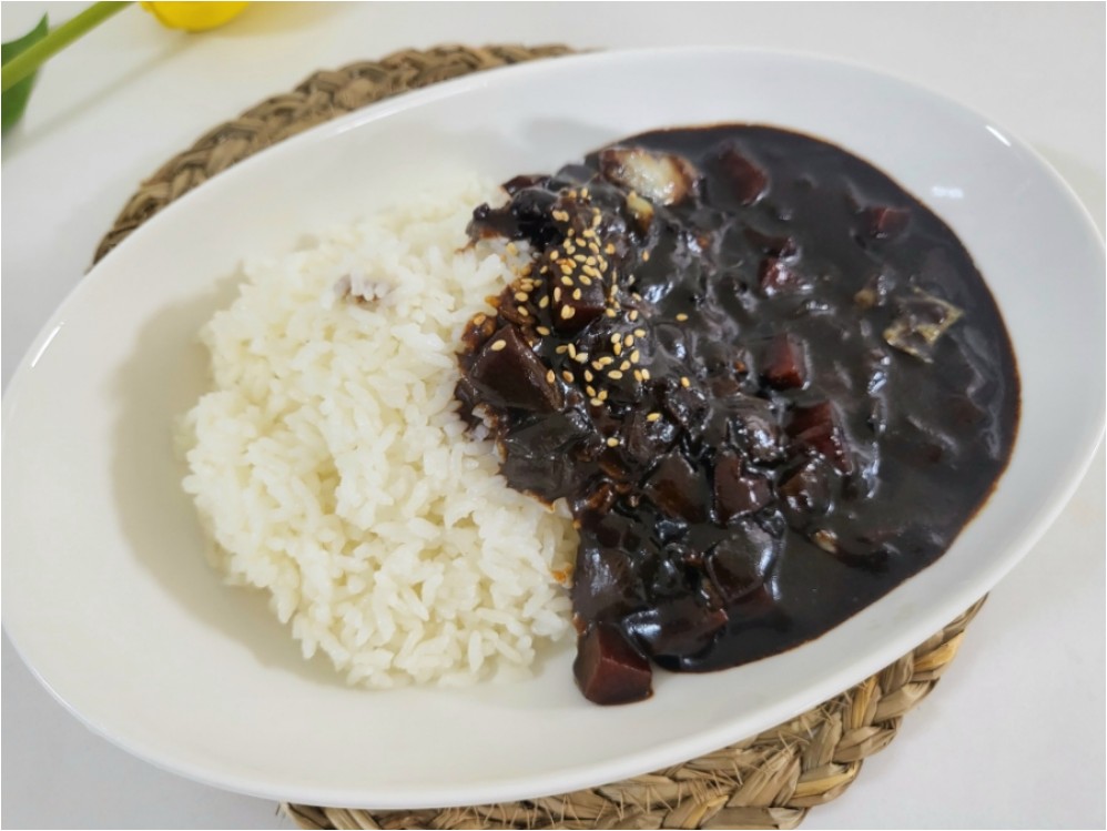 윤기 나고 먹음직스러운 짜장소스를 밥 위에 올려 짜장밥을 만듭니다. 짜장만 넣었을 뿐인데도 맛있어 보이는 비주얼입니다. 계란후라이를 올리면 더욱 좋습니다.