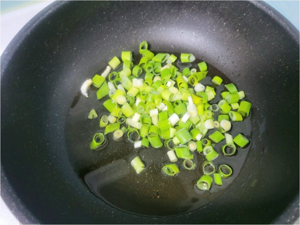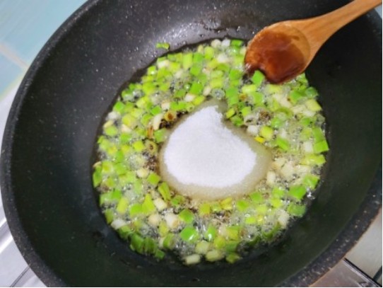 깨끗한 팬에 춘장을 볶고 남은 식용유 반 컵과 대파를 넣어 파기름을 냅니다. 파기름이 나오면 굴소스 1큰술을 넣고 설탕 1/3컵을 넣어 설탕을 눌리듯이 볶습니다.