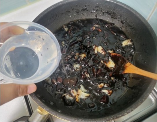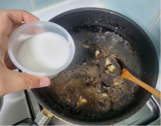 만약 간짜장을 원한다면 춘장 1큰술만 넣어 볶고, 일반 짜장을 원한다면 춘장을 모두 넣고 전분물과 물 300ml를 넣어 잘 저어줍니다. 전분물은 한 곳에 몰아 넣지 않고 골고루 둥글게 넣습니다. 전분물이 들어가면서 걸쭉해지는 짜장을 확인할 수 있습니다. 농도가 맞춰지고 보글보글 끓으면 완성입니다.