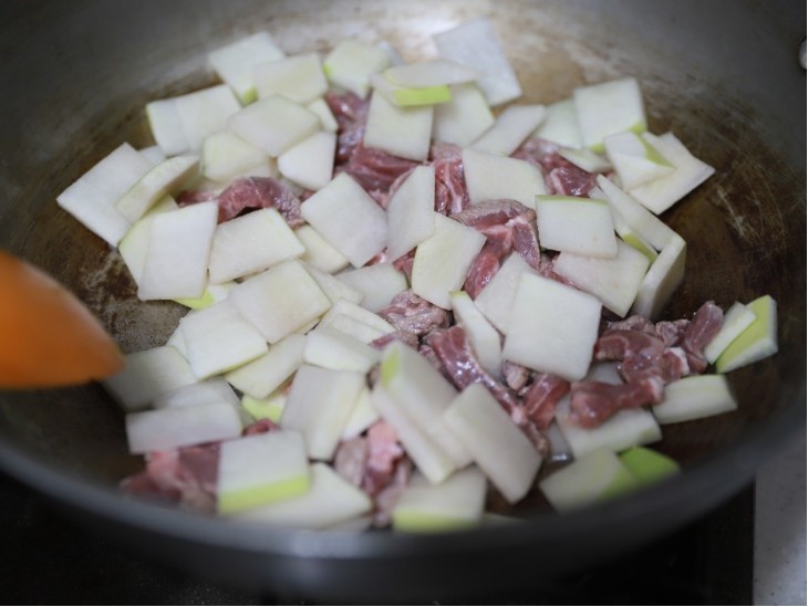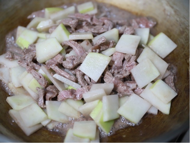 - 볶기: 참기름 한 큰술을 두른 냄비에 소고기와 무를 넣고 볶아줍니다. 고기가 거의 다 익고 무가 투명해지면, 물 1200~1500ml를 부어줍니다. 물의 양은 취향에 맞게 조절하세요.