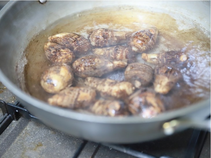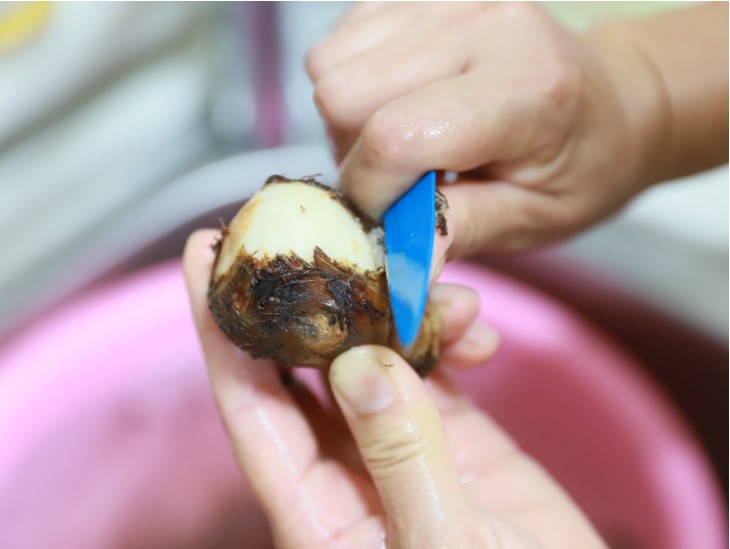 흙이 묻은 토란은 흐르는 물에 한 번 씻어낸 후, 뜨거운 물에 약 5분 정도 삶아줍니다. 데친 토란은 찬물에 헹군 뒤, 칼로 껍질을 벗깁니다. 이 과정에서 중간중간 찬물에 헹구어 화상의 위험을 줄여주세요. 껍질을 제거한 후, 끓는 물에 1분 정도 더 삶아줍니다.