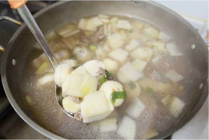 - 토란 추가: 토란을 넣고 간장 한 큰술과 굵은 소금으로 간을 맞춥니다. 맑은 국의 색을 위해 소금을 주로 사용합니다.