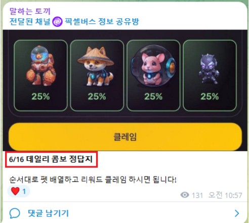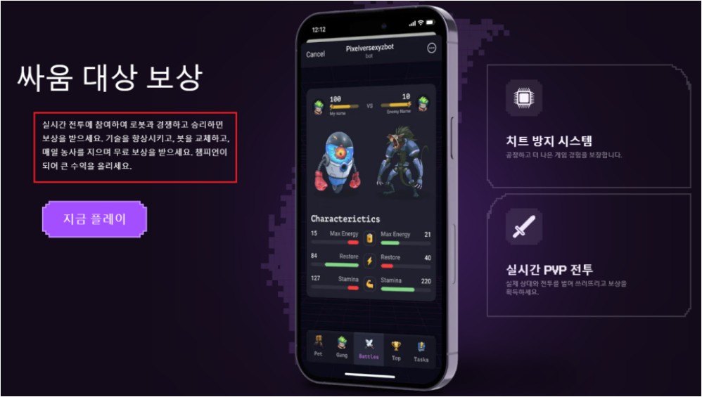 픽셀버스는 텔레그램 기반의 미니 게임 프로젝트로, 사용자가 다양한 활동을 통해 포인트를 적립하고 이를 통해 에어드랍 보상을 받을 수 있는 구조입니다. 주된 활동으로는 봇에 먹이 주기, 전투 참여, 출석 체크 등이 있습니다.