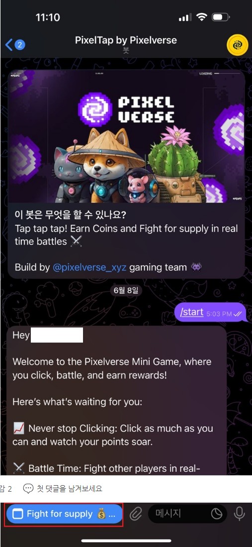 - 픽셀버스 텔레그램 봇 링크를 클릭하여 봇에 접속합니다.