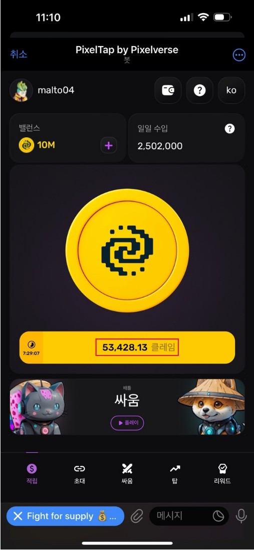 - 봇 먹이 주기: 8시간마다 클레임 가능.