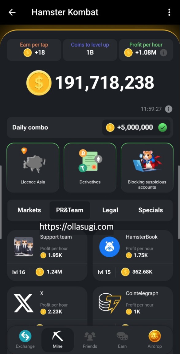 Mine 메뉴에서 각종 카드를 업그레이드하여 3시간마다 한 번씩 접속해 나의 거래소가 채굴한 토큰을 획득할 수 있습니다. 시간당 받는 코인이 탭하는 것보다 훨씬 많기 때문에 이 방법이 더 효율적입니다.